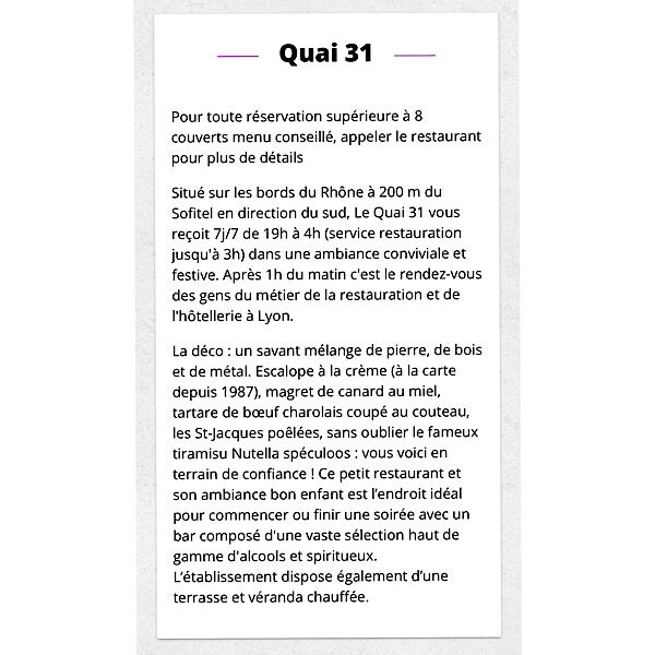 Souhaitez-vous passer une soirée agréable et accueillante autour d’un repas français fait maison dans notre restaurant ? Le « Quai 31 » enchante petits et grands – vous serez conquis par des plats succulents servis dans une atmosphère chaleureuse. Notre zone extérieure chauffée vous assure une atmosphère détendue et vous invite à rester plus longtemps. Quel que soit le temps, nos salles climatisées vous garantissent toujours des températures agréables.